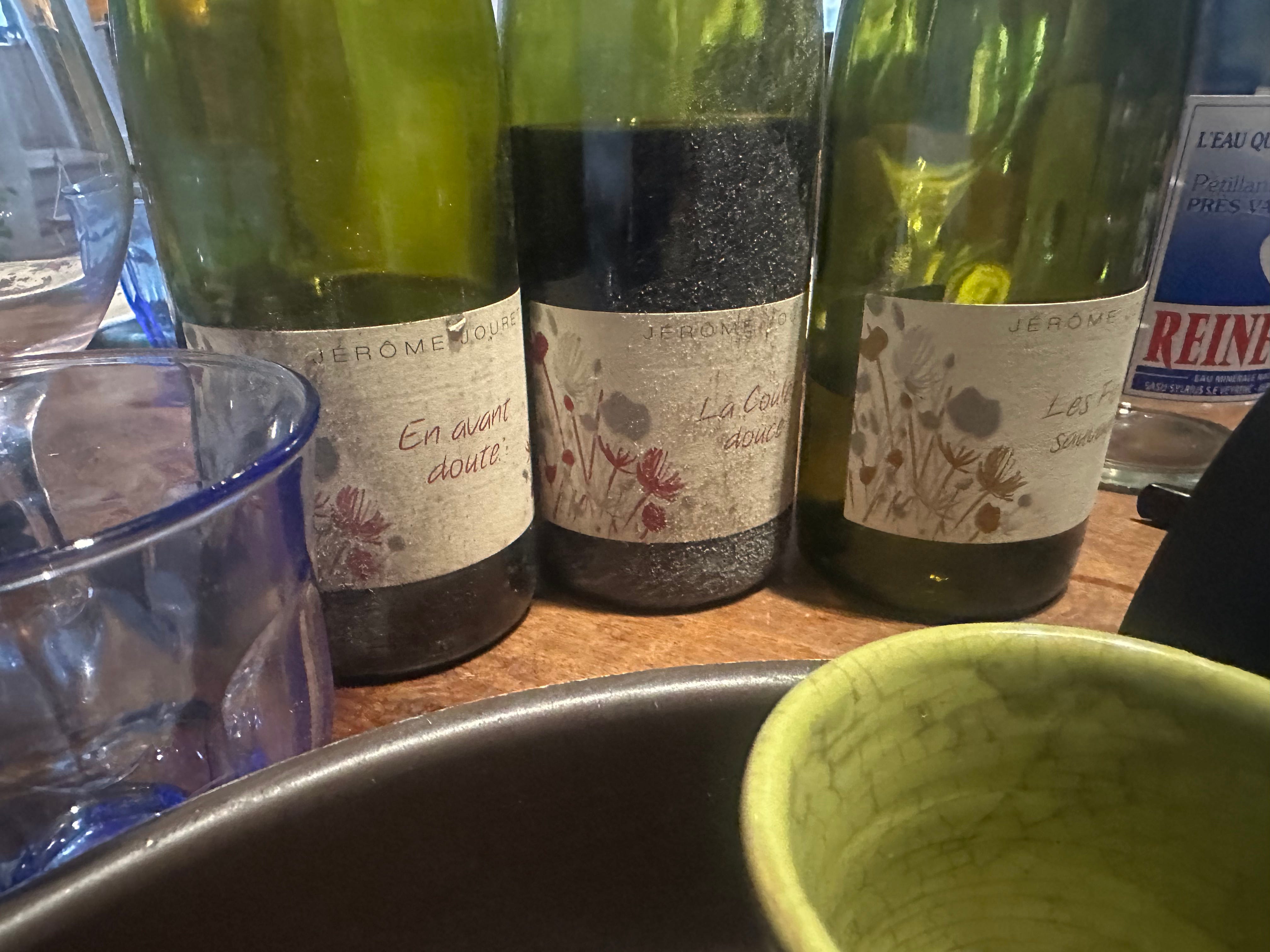 We were in the middle of lunch at the long table, just past the swing that is a feature of Jérôme and Stéphanie Jouret’s living room. There was a tart. There were potatoes. There was plenty of wine. And Stéphanie showed us the new labels—small, tiny things. The domaine was getting an update.
